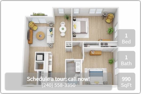 We currently have a gorgeous 1 bedroom 1 bathroom renting for $1695 per month. This apartment home comes with 990 sq ft.