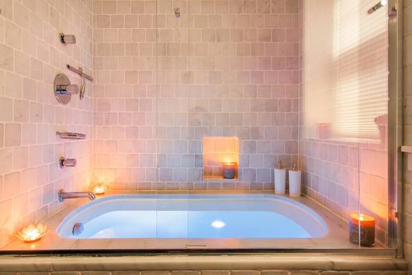 - Spa like master bathroom with Bain Ultra Meridian 50 soaking tub, floor to ceiling white marble tile, and double vanity