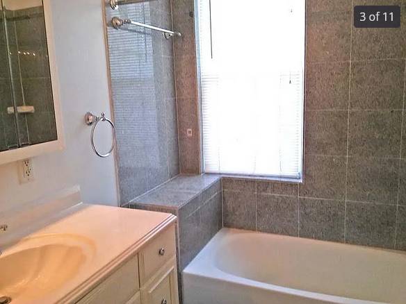 Upstairs: Both bedrooms; bigger room has space for a king bed, smaller room has space for a queen bed. Full bath is at the opposite end of the hall complete with a shower/tub and plenty of counter space and vanity storage for two people.