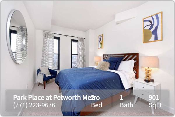 Description: Modern boutique apartments are in reach at Park Place at Petworth Metro! Filled with the features you can't live without, you'll always look forward to staying in. Working out, relaxing on the rooftop, partying with friends, or checking e-mail; whatever you have in mind, our Petworth/Columbia Heights apartments of Park Place have it on site.