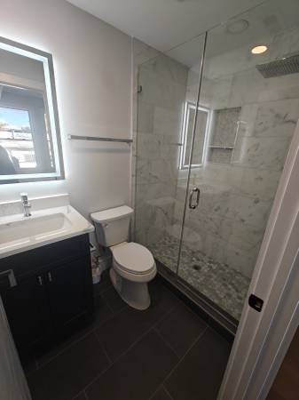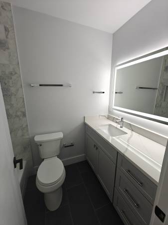 Lower level: spacious modern kitchen featuring Bosch appliances and granite countertops, living room with tons of natural light and a convenient half bath— perfect for get-togethers. Also on this level: a bedroom with its own bathroom and closet.