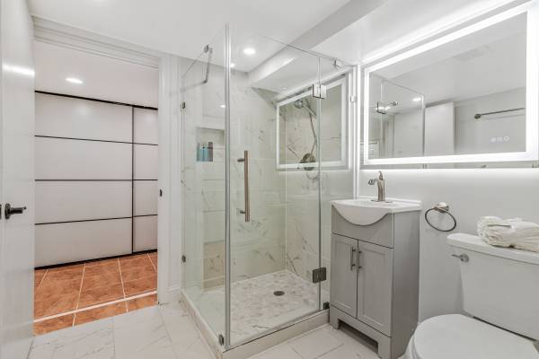 Upstairs, hardwood floors continue into three bedrooms, a master one with an ensuite bathroom, two additional rooms sharing a full bathroom, and a porch that can be set up as an office. The fully finished lower level boasts two additional bedrooms and a third full bathroom—ideal for guests or extra living space.