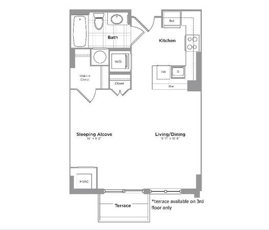 Large studio sleeping alcove, terrace area, wager and dryer, walk in closet and added closet space. This apartment requires a $Starts at $600 and can be One month's rent deposit.
