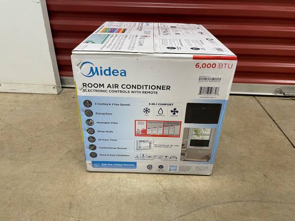 The Midea 6,000 BTU Window Air Conditioner cools up to 250 sq. ft. and eatures a Comfort Sense Remote that adjusts cooling strength based on its location. It has 3 cooling modes, 3 fan speeds, and an Energy-Save mode. The unit is designed for smaller spaces, fits winclows 23-36 wice, and has a minimum height of 13. It includes a 24-hour programmable timer, clean filter indicator, and sleep mode. The air S conditioner is suitable for bedrooms and ofices, providing fiient cooling with easy installation and maintenance.