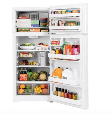 GE 17.5 cu. ft. top-freezer refrigerator. Organize interior space with adjustable wire shelves, great natural-looking light. With temperature controls, simply regulate both the fresh food and freezer sections. Has two adjustable glass shelves in the fridge. Easy to clean.