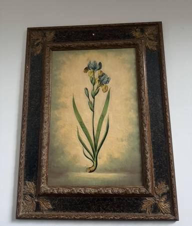 Selling a beautiful, vintage-style botanical painting featuring a delicate iris flower against a muted, textured background. This elegant artwork showcases classic realism, with careful attention to the plantβs natural form and detail. The piece is set in a richly ornate, gold-accented frame with leaf motifs, adding a timeless, sophisticated touch to any room. Includes: