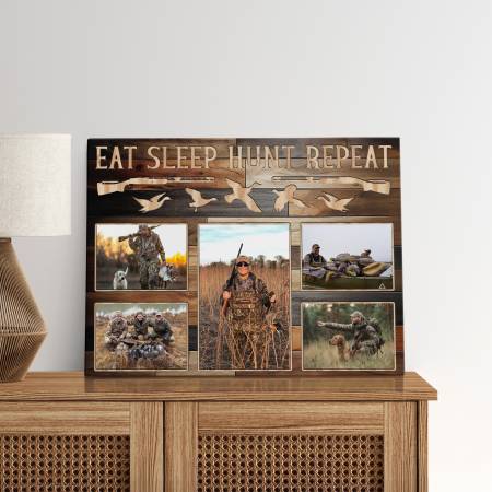 Celebrate your waterfowl adventures with this rustic Eat Sleep Hunt Repeat canvas. Featuring duck silhouettes, woodgrain textures, and customizable photo slots, it's designed to turn your hunting memories into a personalized work of art.