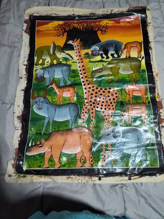 Ready for framing. Two Signed Original African Paintings. Acrylic on Canvas. By Tanzanian local artist, Mariam. Circa 2005.