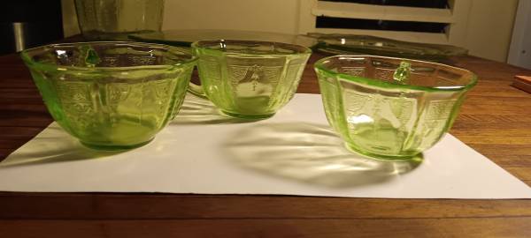 Vintage and rare these 3 green uranium teacups are in excellent condition. No chips or cracks. Glow a vibrant green under UV light due to the presence of uranium. Features the dainty Princess pattern and made in the US in the 1930s by Anchor Hocking.