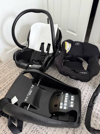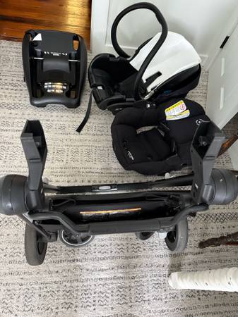 Like new rear facing infant carseat and base that detaches and fits onto the stroller. Comes with stroller adapters. The stroller easily folds up (as in photo) to fit into your trunk. The car seat...