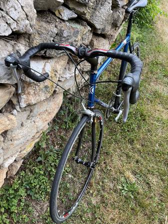 Shimano 105 component group. Chris King headset. Shimano Sora “Flight Deck” brake levers/shifters or “brifters”. Kinesis carbon fiber fork and carbon fiber handlebars