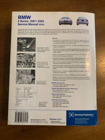 Selling my e39 BMW 5 Series Service Manual (Bentley Publishers), Volume 2. This book is in good condition, no pages missing or torn up or anything like that. These sell for a lot more on eBay,...