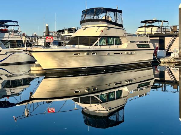 This 1987 Hatteras Double Cabin is ready for her next adventure as a liveaboard or for weekend cruises. One of the most popular Hatteras models, she features two staterooms including a roomy aft stateroom with a queen-sized walk around bed and lots of storage, two heads each with their own stall showers, a large salon with sectional sofa, u-shaped galley, breakfast bar, large aft deck, and enclosed flybridge.