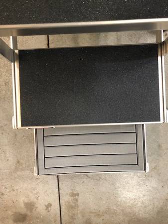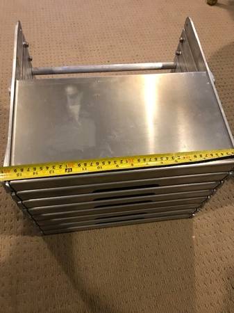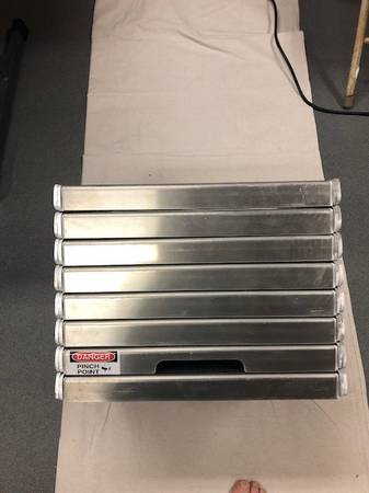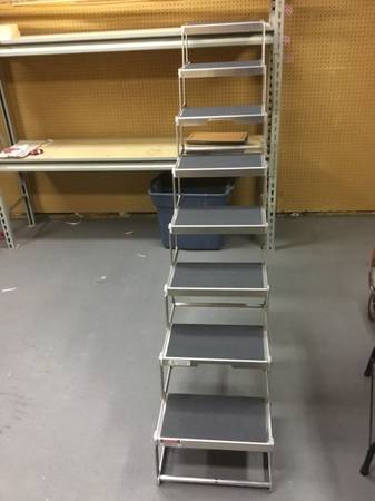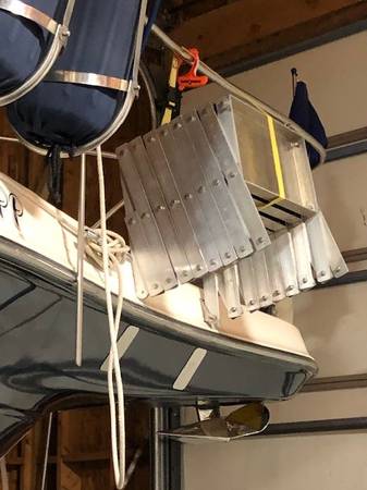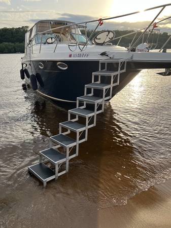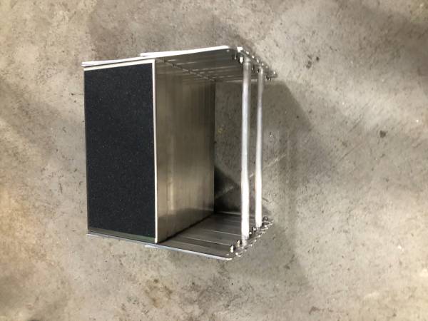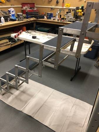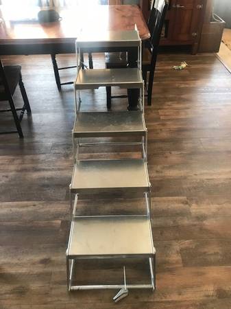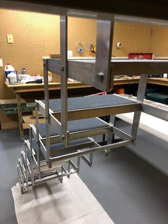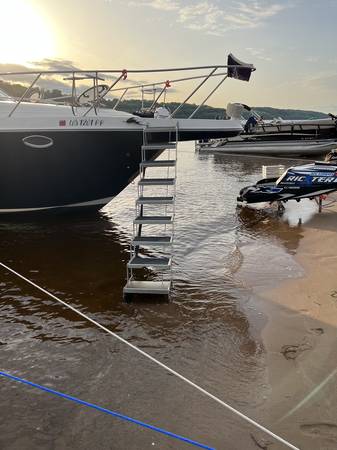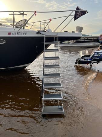 Aluminum boat ladder, Bow to Beach Ladder. Slip resistant treads, easy collapse. Mounting Brackets, Additional rear braces for extra support. Extra steps available. Can make steps from 3-12 steps--Great for Pontoons as well. Great for dogs and Us older individuals. Made in USA-Message for Pricing--Can Ship as well for extra cost of shipping. Excellent quality and construction. High end product at a Great Value!!