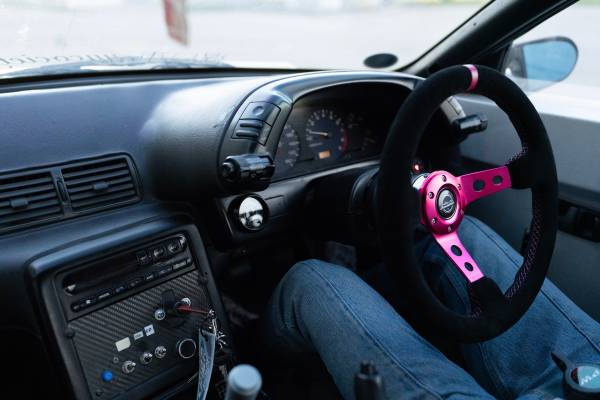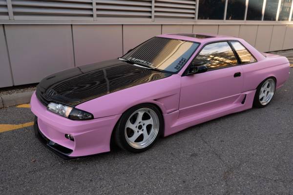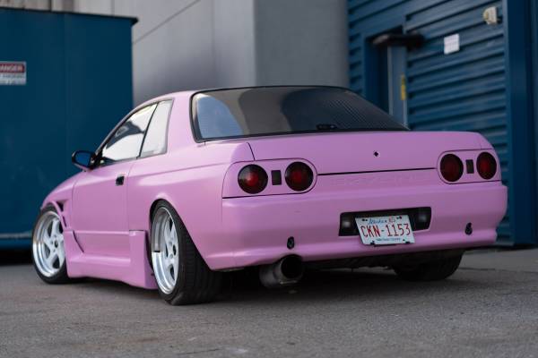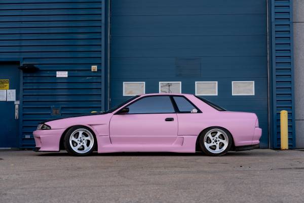 Up for auction is this 1991 Nissan Skyline GTS-T, finished in a light pink wrap with the original gray paint shown in photos. It’s powered by a turbocharged RB20DET inline-six with an R33 turbo upgrade, paired with a replacement 5-speed manual, Stage 2 clutch, and LSD. Highlights include ISR coilovers, Do-Luck bodywork, a stripped interior with bucket seats and harnesses, and 187k km on the chassis with ~1,500 km added in the past five years.