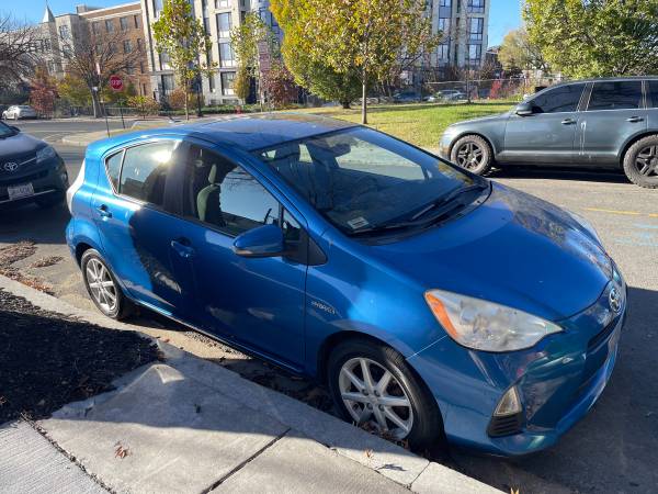A blue 2013 Toyota Prius C Hybrid, with a 136k miles and a clean DC title offered for $5500. It is in great condition, privately owned with no liens or debts. Fuel efficient, automatic transmission, and perfect to drive / park in the city. Selling only because we are leaving the DC area and no longer need two cars. Very reliable, never failed me on my commute between Greenbelt Md and DC for the last 5 years. Very minor cosmetic damage on rear drivers side.