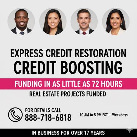 With over 17 years in business, my team and I are committed to helping individuals and business owners take control of their financial future. Whether youβre working on a real estate project, trying to secure business funding, or simply need help repairing and boosting your credit, we have the resources and experience to help you succeed.