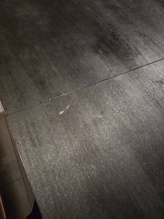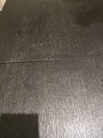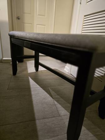 Black dining table bar style. Comes with 3 chairs and a bench. Has storage underneath with sliding doors. Table has some scratches and nicks. Dimensions: LxWxH 60"x43"x37"