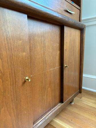 MidCentury Modern China Cabinet for sale - in good shape with some wear and needs a few repairs. Comes with one glass sliding door - needs another. Really nice piece of vintage furniture. Not sure of the make but says “May 1959” under the drawer. Dimensions: 62”H x 35”W x 16”D. MCM.