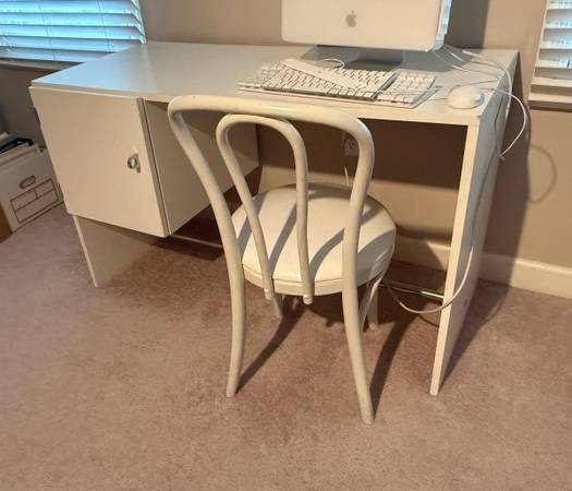 A simple streamlined white desk make of wood composite that is perfect for smaller spaces and simplicity. Had side door compartment. Comes with white chair. Dimensions: 48” length, 21” depth and 29”...