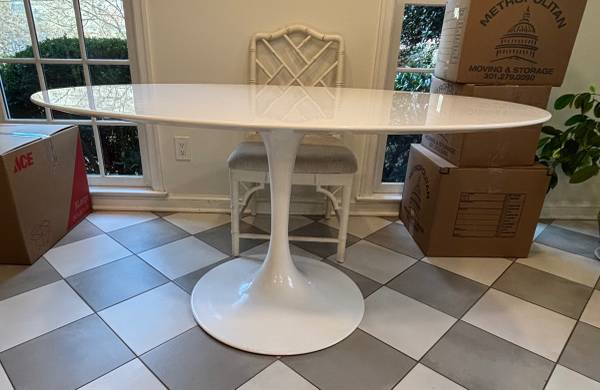 Tulip Table Oval - Lacquer 60” x 35.5” Good condition. Has some minor scratches and marks, but no gauges. Very heavy. $1,800 new