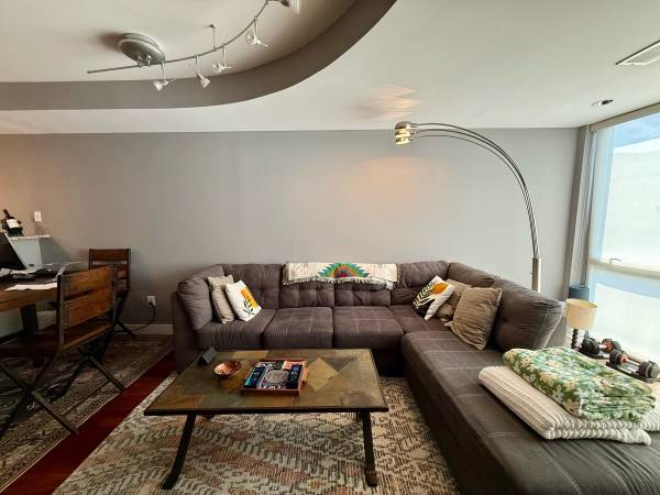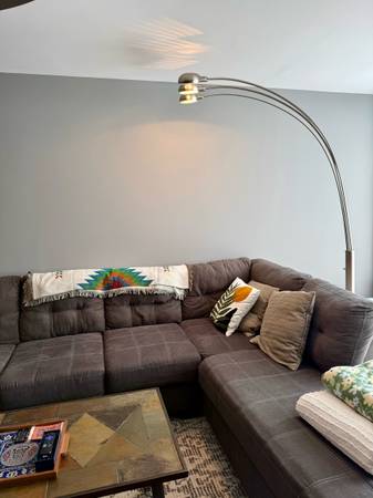 Large, stylish floor lamp! 7 ft. tall, brushed nickel. Base is very sturdy and fits under a couch.