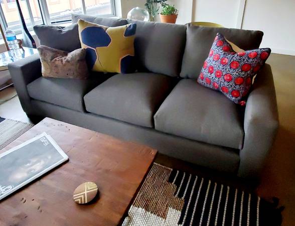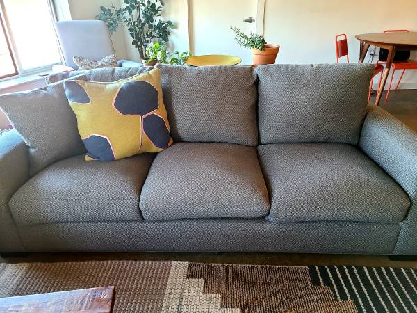 This beautiful gray sofa is 96". The fabric is grey with gold woven in. The fabric is removable and machine washable (air dry only). The cushion filling was recently replaced with comfort foam, so it keeps its shape, and feathers no longer come out everywhere. I am only selling this beauty because it won't fit through the doorway. The total cost was $3300.
