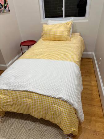 Brand new (but assembled) IKEA Neiden pine wood twin bed frame with IKEA Luroy slatted bed base and IKEA Vesteroy pocket spring mattress. All three pieces brand new - never used. Purchased this month for a home sale staging and now no longer needed. Bought new for $330. Selling for $200. Must be gone by 12/8. Happy to throw in an also brand new white ikea fitted sheet.