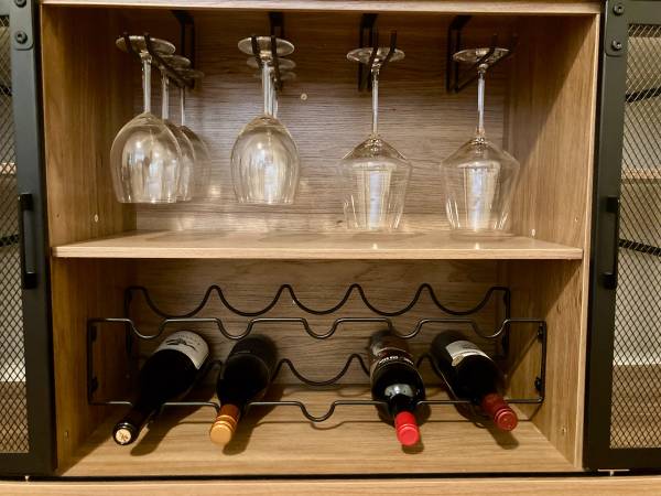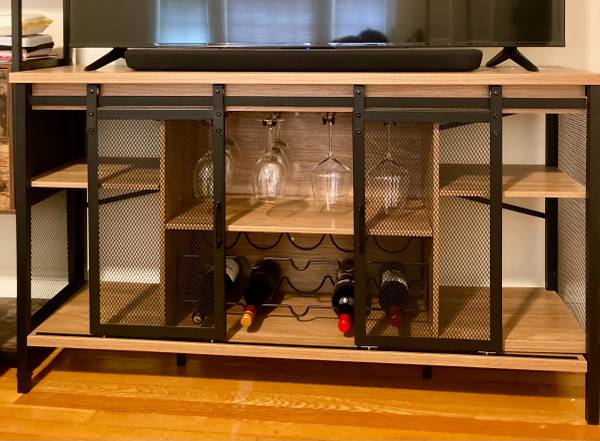 Wood and iron cabinet with sliding doors (wine bar and TV stand) Dimensions: 15.16"D x 55.12"W x 31.5"H Original price: $350 + taxes Recently purchased, very well kept (not a scratch). Selling it...