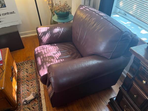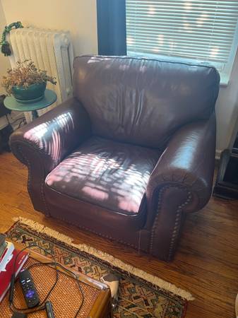 $50 - brown leather chair with minimal fading/cracking to the left arm. Damage to the back.