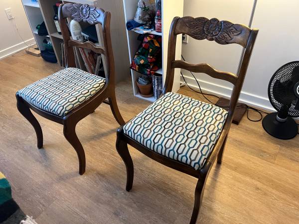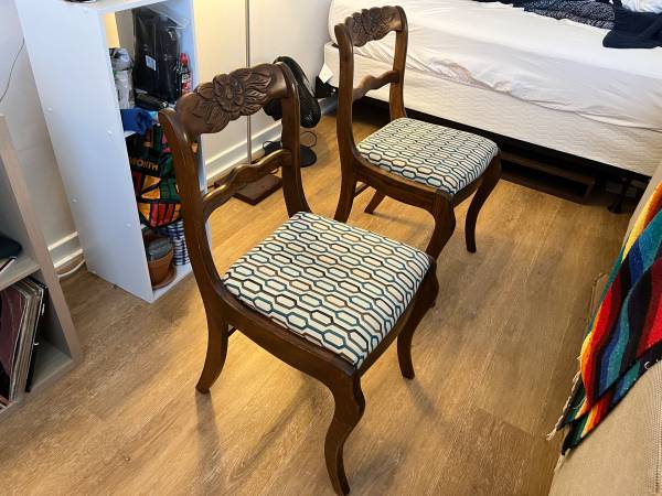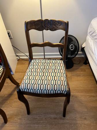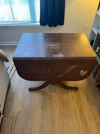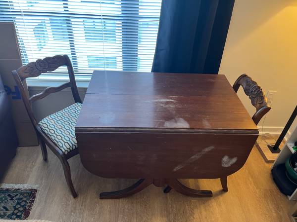 FREE - dining table seats 2 with 2 chairs; can seat 4 with leafs up, can seat 6 with leafs+included middle panel that can be added/removed. Steam damage and some damage to the top of the table. Chairs in great condition!