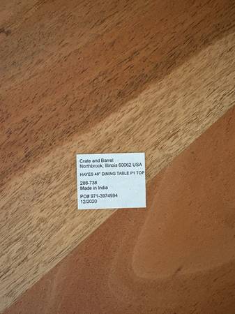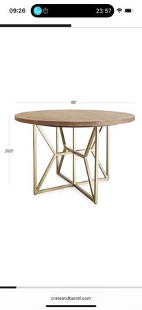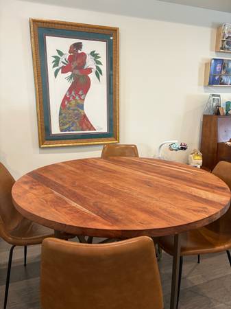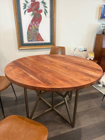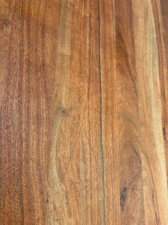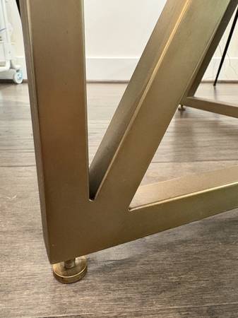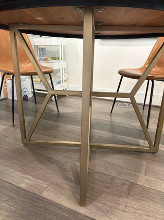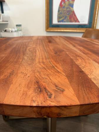 Selling this beautiful table only because we need a bigger one now that we have kids! This is a solid acacia wood table with brass base and adjustable feet to ensure it’s level. We have used this every day since it arrived in 2021 and you can hardly tell. There are some shallow scratches in the wood (pictured) but because this is solid wood and not a veneer, it looks more like a natural aging than actual damage.