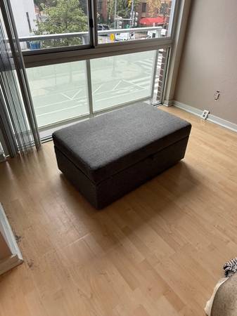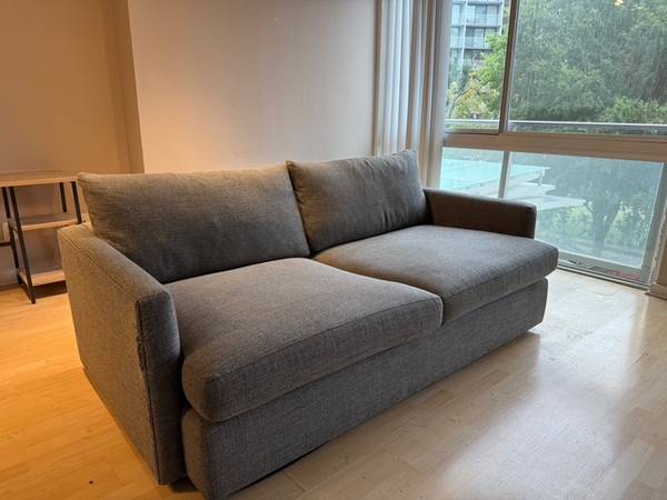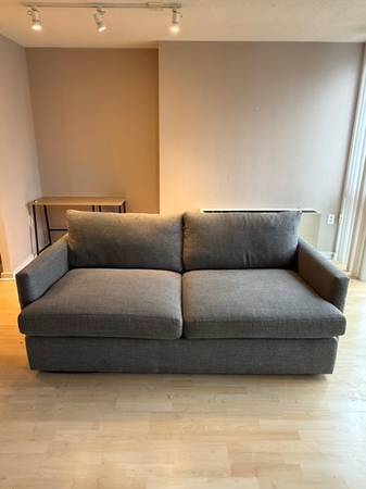 Crate and Barrel Lounge Sofa in good condition in Taft Steel fabric. Love the sofa and has held up incredibly well, although my cat has also enjoyed it, so there are some minor scratches/damaged fabric on the arms of the sofa (shown in photos). Matching storage ottoman also available in another post. Can be purchased together as a matching set for a discount. Buyer must pick up and arrange moving the sofa. To purchase this sofa new today it would be $2,250. Moving and must by sold by Oct 3.