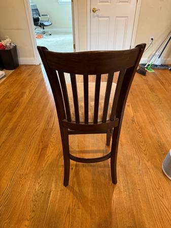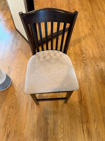 Each chair has a comfortable, padded seat with neutral beige fabric and a sturdy slat-back design for support. Perfect for kitchens, dining rooms, or breakfast nooks.
