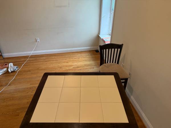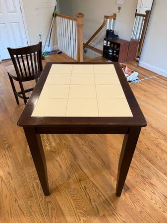 Upgrade your dining space with this beautiful solid wood table set featuring a durable tile-inlay top and four matching chairs. The table’s rich dark finish contrasts perfectly with the cream-colored tile surface for a timeless, versatile look that fits any home décor.