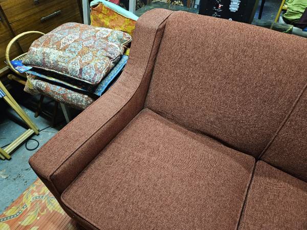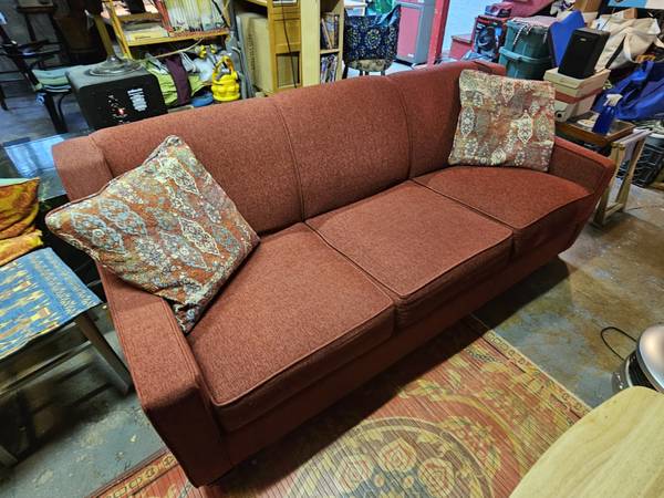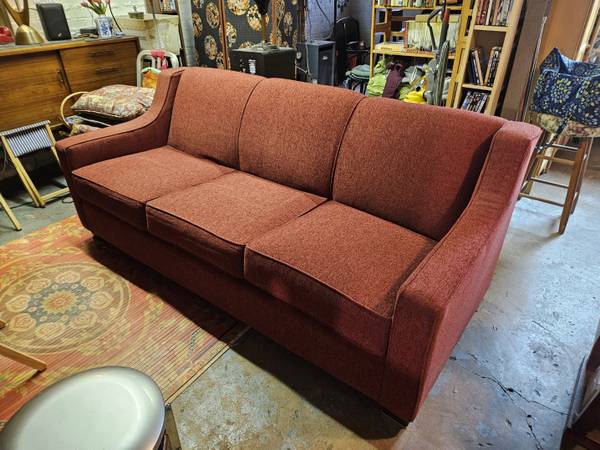 Like new (lightly used) comfortable 3 seater tight back sofa. Spring down cushions are reversable. Thick coil mattress. Frame is solid natural wood. Comfortable as a couch or a bed.