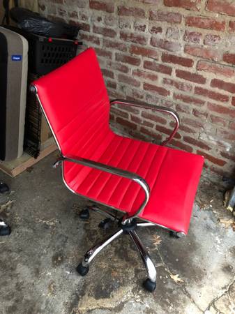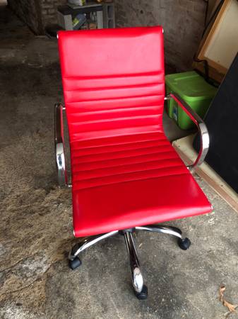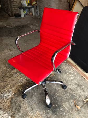 I have a modern office chair for sale with premium red vegan leather and a durable stainless steel base. The height is adjustable and equipped with a tilt mechanism for optimal back support and comfort. The chair also has a swivel function and smooth-rolling wheels for effortless mobility and convenience.