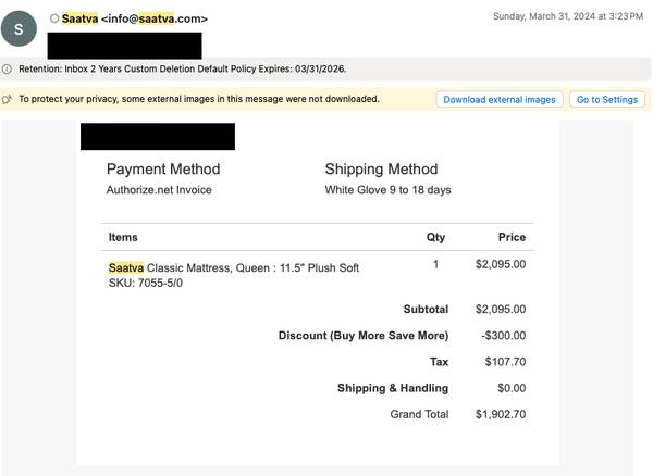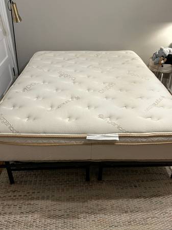 We paid $1,900 for it originally. It is Saatva Plush Soft style and made with organic cotton. It also comes with a simple black frame.