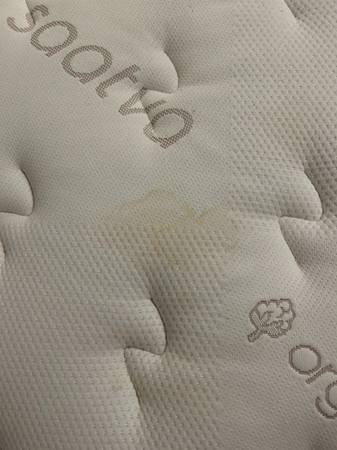 There is one small water mark near the top and some pilling and slight discoloration on the right side of the mattress. Otherwise the mattress is in great condition. It's from a non-smoking home.