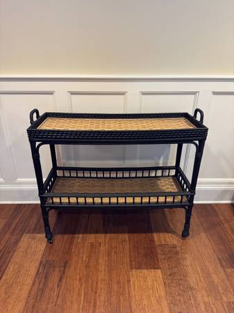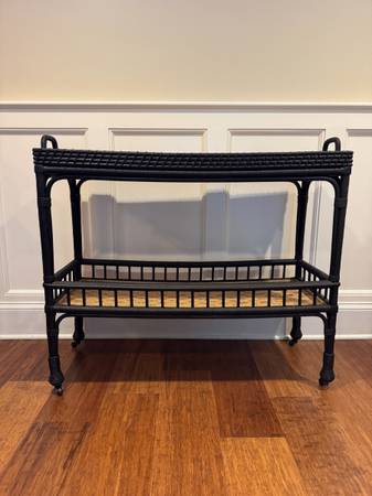 Handcrafted of rattan. Refined woven detailing is paired with two levels of functional storage, providing an effortlessly chic way to prepare for happy hour.