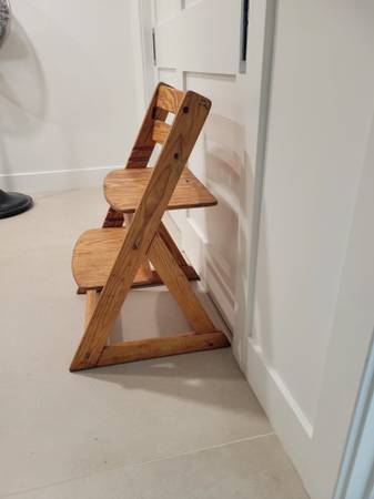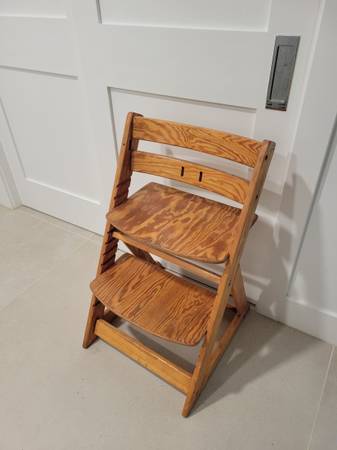 Solid wood adjustable high chair. Natural wood color. This is an awesome chair that we loved. It is like the Stokke Tripp Trapp.