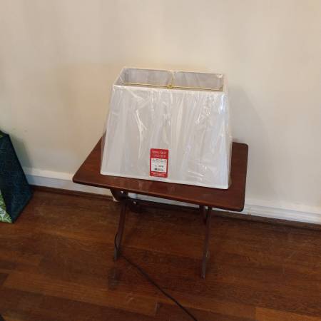 Ivory linen fabric shade, rectangular shape with tapered sides.