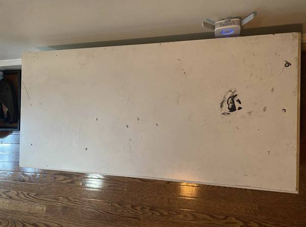 Sturdy white trunk that definitely needs some cosmetic work. While it may need a new paint job, it is in great shape otherwise and holds a lot of stuff.