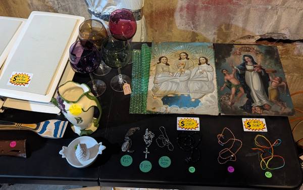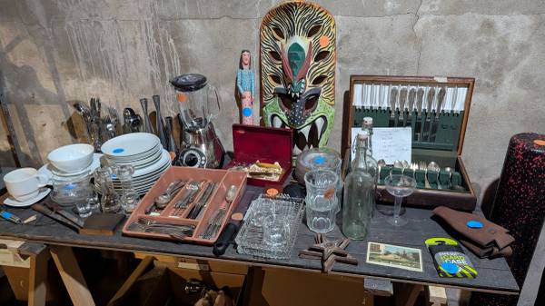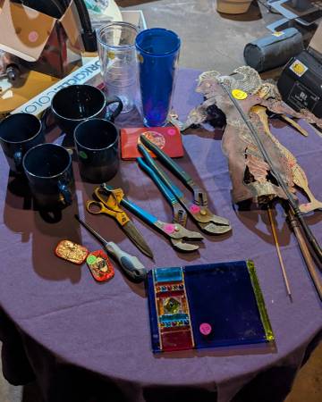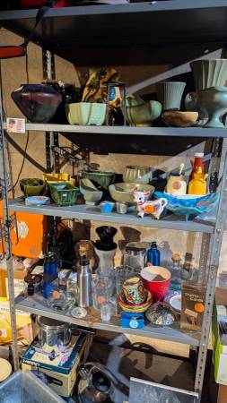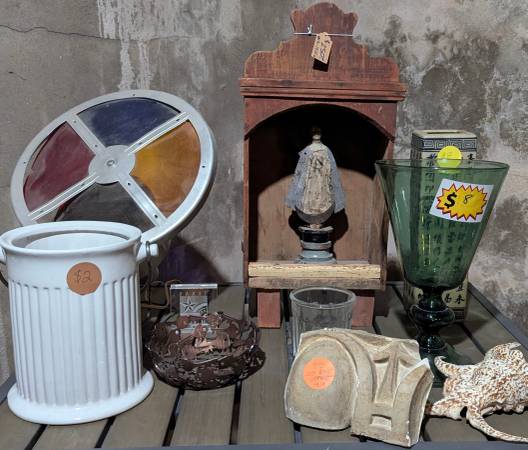Tons of COOL STUFF - including art pottery, international folk art, vintage items, original art, screen door, antique door with hardware, kitchen items, light fixture and much more!!