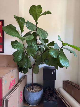Also known as a Ficus Lyrata, this is a beautiful houseplant that with the right amount of care will add beauty to any room. Be careful to make sure this plant isn't moving around a lot or near a drafty window because it is known to be fickle fig! Ficuses are well known as houseplants, much of which can be attributed to their role as large specimen plants in the home. There are a wide variety of leaf shapes, sizes, colors, and textures, but most ficuses are woody plants that over time develop a strong trunk and tree-like branching structure. The Fiddle Leaf Fig, one of the most common species, prefers strong indirect light, but most of the varieties you’ll find would prefer at least some direct sun, and many thrive in as much as full exposure in a southern window. Ficuses have a reputation for dropping leaves after moving locations or changes to their routine, but this is also quite variable depending on the species. Most prefer a thorough watering followed by an almost thorough drying out.