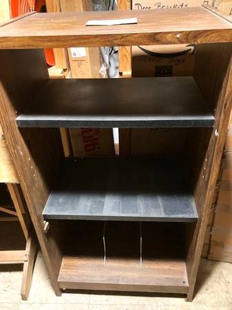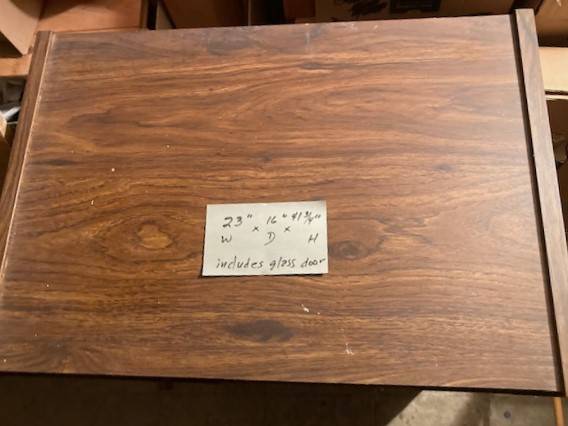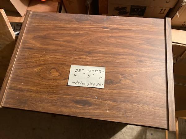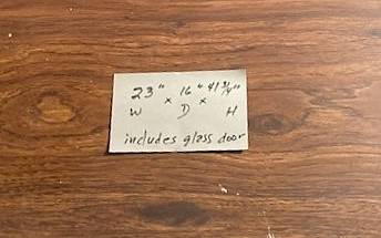 in-tact and in good condition. Wheels / casters are in place and function well. includes glass door, stored separately and in excellent condition. dimensions: 16" d x 23" w x 41.75" h