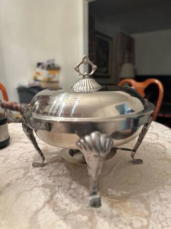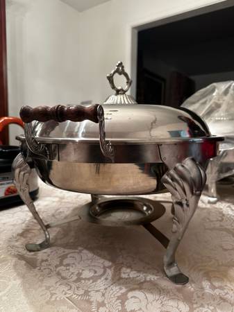 TableCraft two-6 qts round stainless steel chafing dishes with gold accent. Made with solid construction steel and made to last.