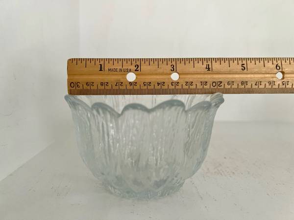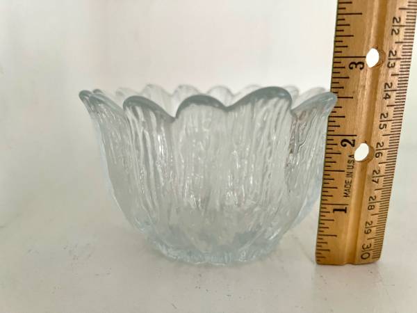 This small bowl was designed by Sidse Werner for Holmegaard Copenhagen in the late 1960s. The design is a tight starburst in a ridged crystal ice or Ice bark texture, and a deeply scalloped edge, to resemble petals. The texture is on the exterior of the bowl, the interior is smooth.