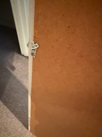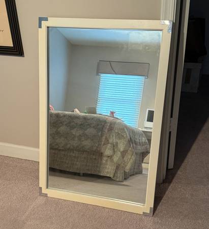 Large heavy rectangular mirror white with silver metal corners. In good used condition. Has hooks and ready for hanging on wall. Dimensions: 26 1/2 x 39” x 1”