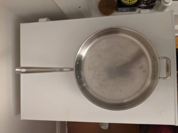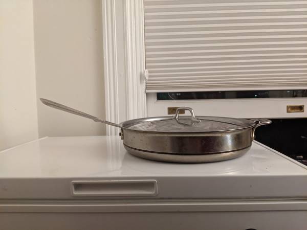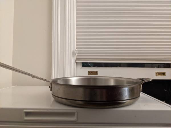 Note: The pan isn't 100% flat and has a slight wobble on a flat surface. You won't notice it on a gas stove but it might spin on a flat cooktop.